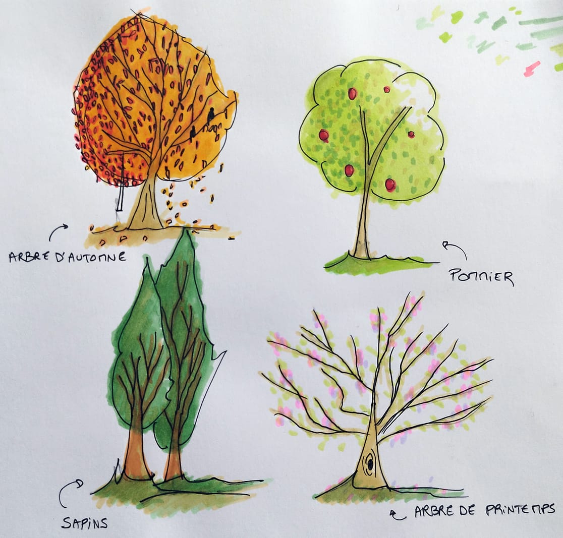 Esquisses d’arbres au feutre à alcool et à l’aquarelle.